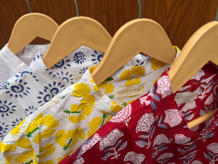 Our coord sets are designed for slow mornings, sunlit walks, and everything in between. Hand block printed on pure cotton, each print tells its own little story — a keepsake from White Wing to your everyday escapes.